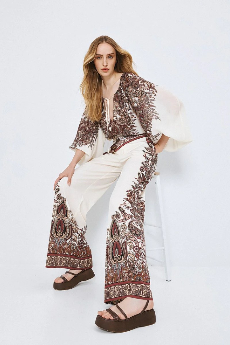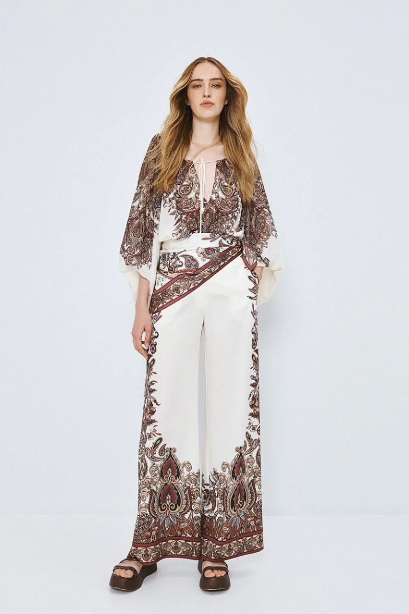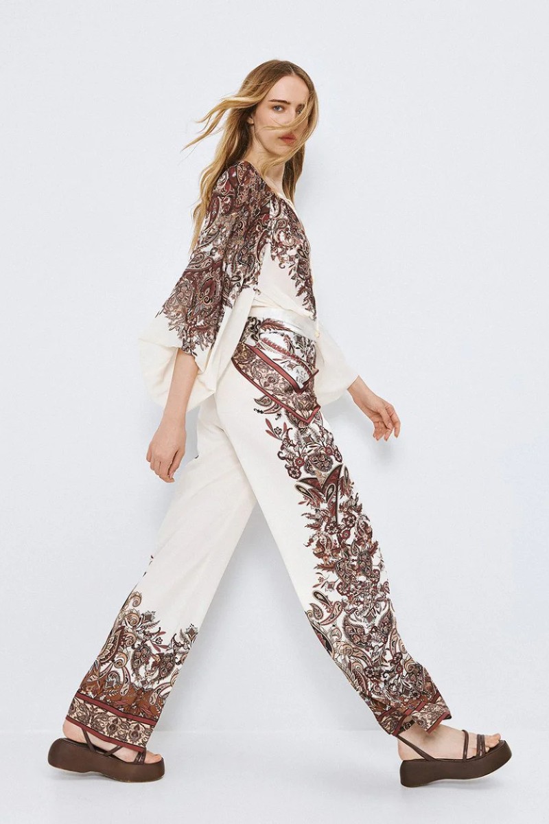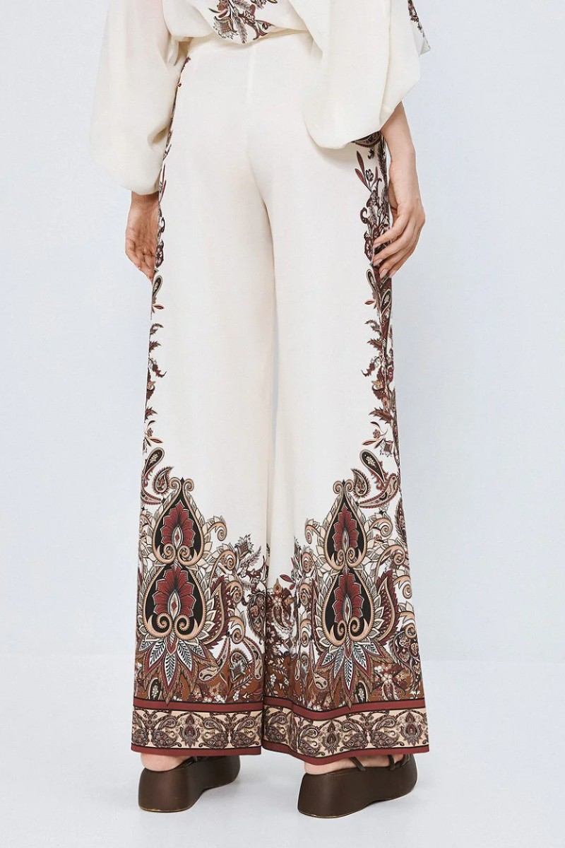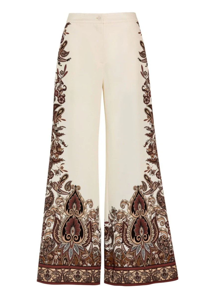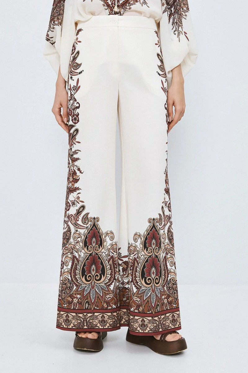 Εμπριμέ ψηλόμεση παντελόνα με πλαϊνές τσέπες και κλείσιμο με φερμουάρ και κουμπί μπροστά.