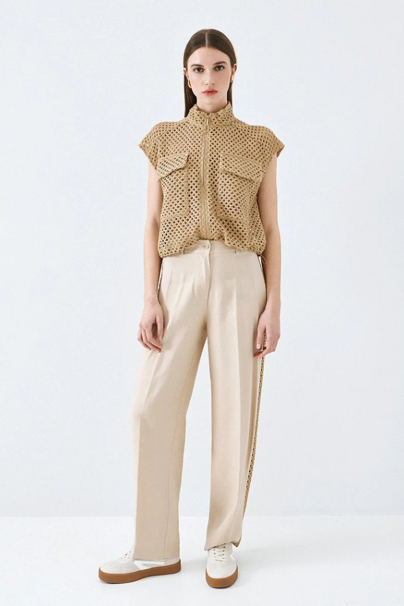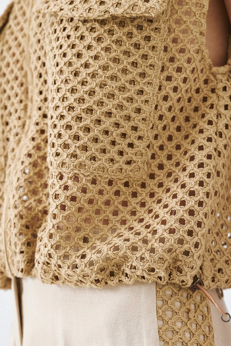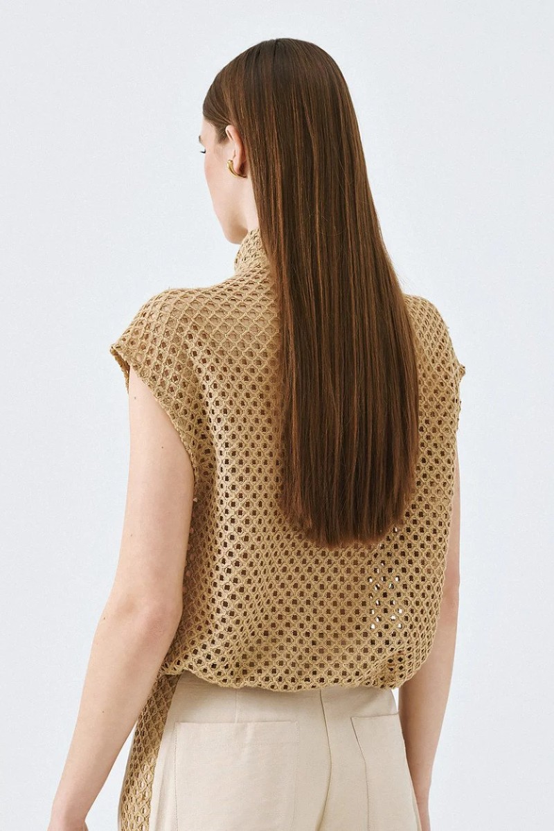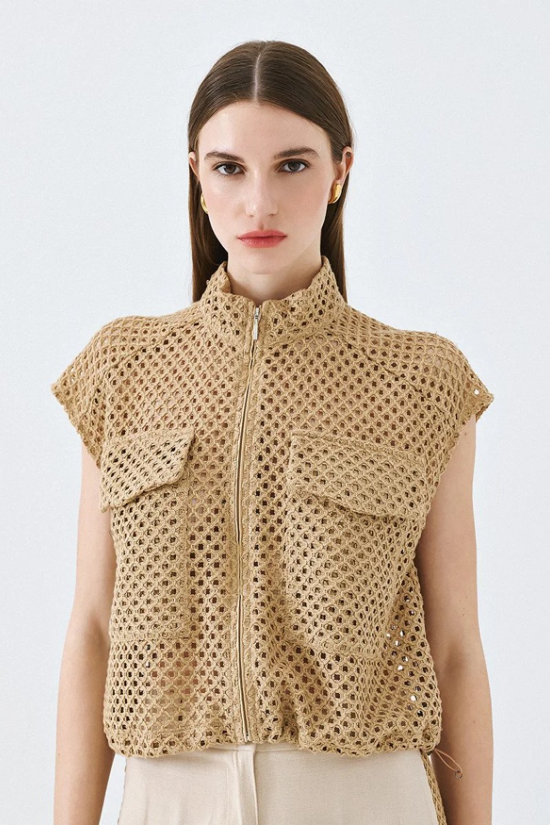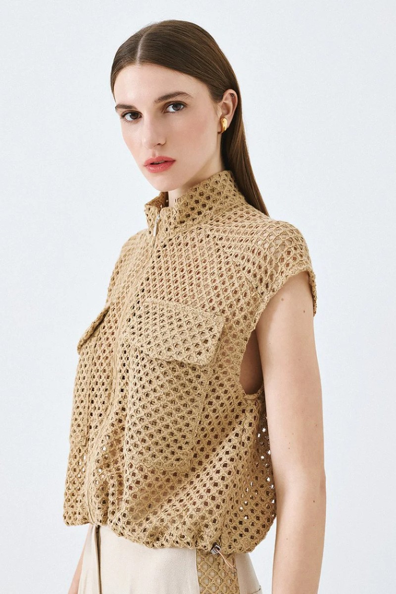 Διάτρητο κροσέ αμάνικο γιλέκο με ψηλό λαιμό και κλείσιμο με φερμουάρ μπροστά.