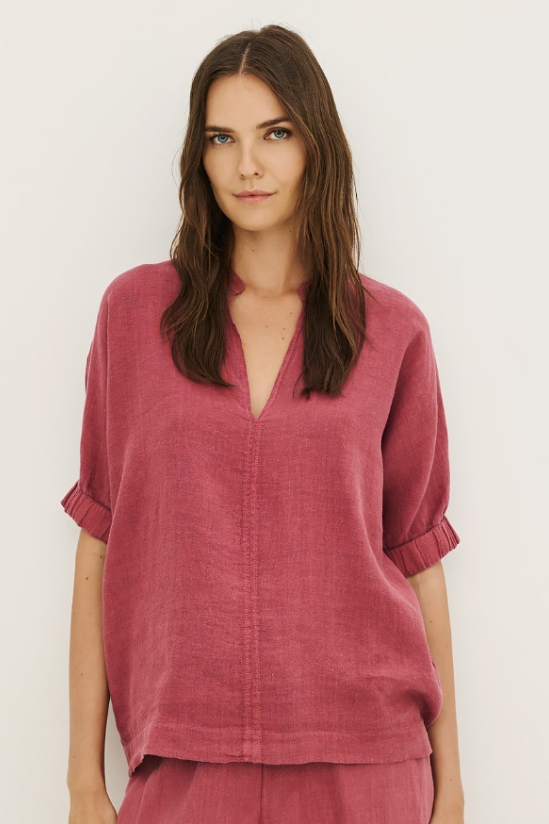 Λινή μπλούζα με μάο γιακά και V λαιμόκοψη