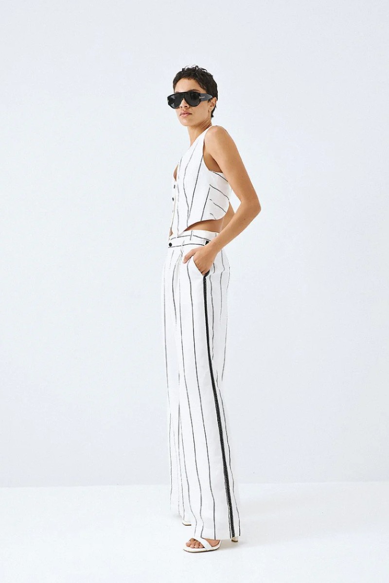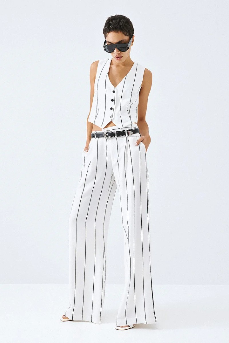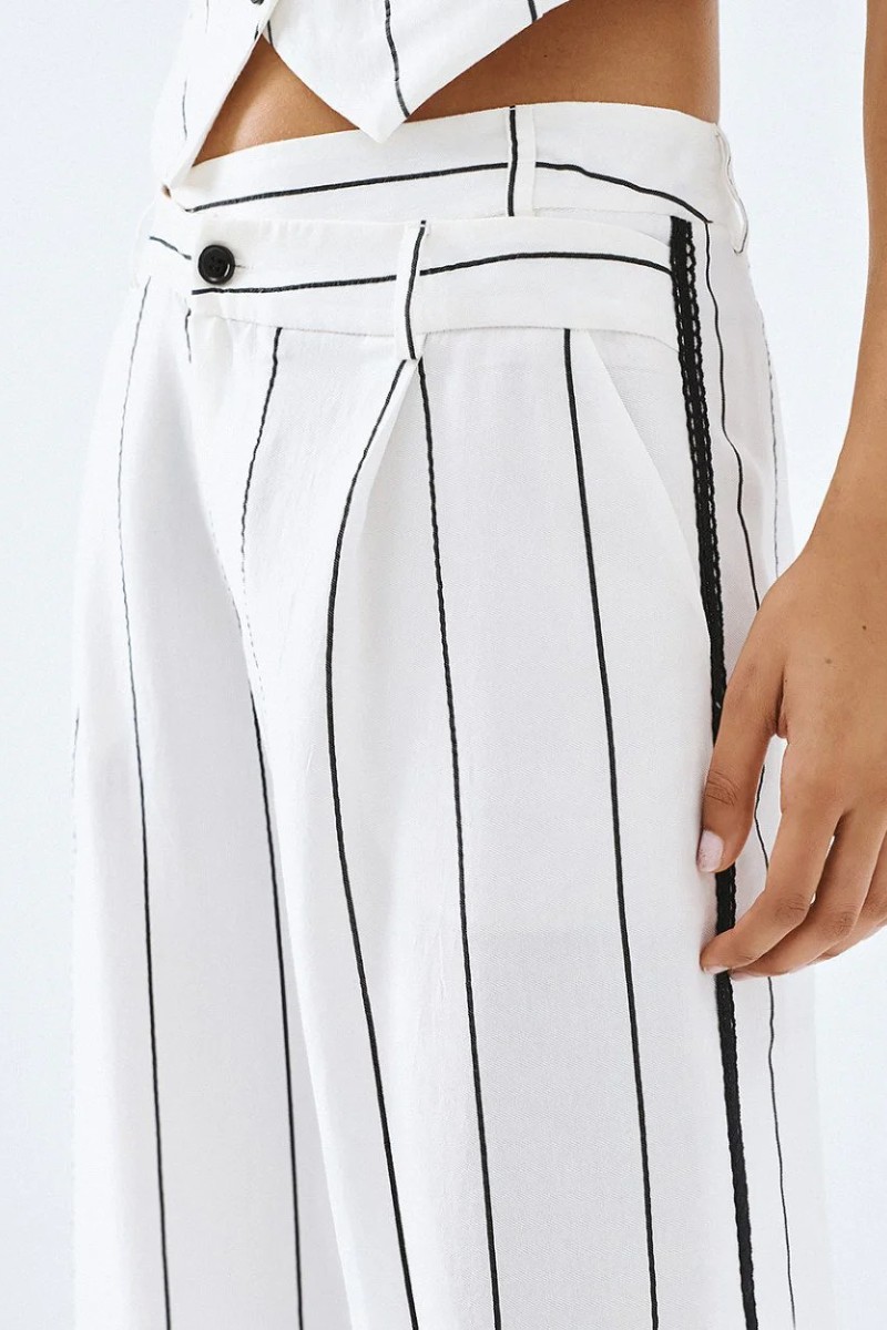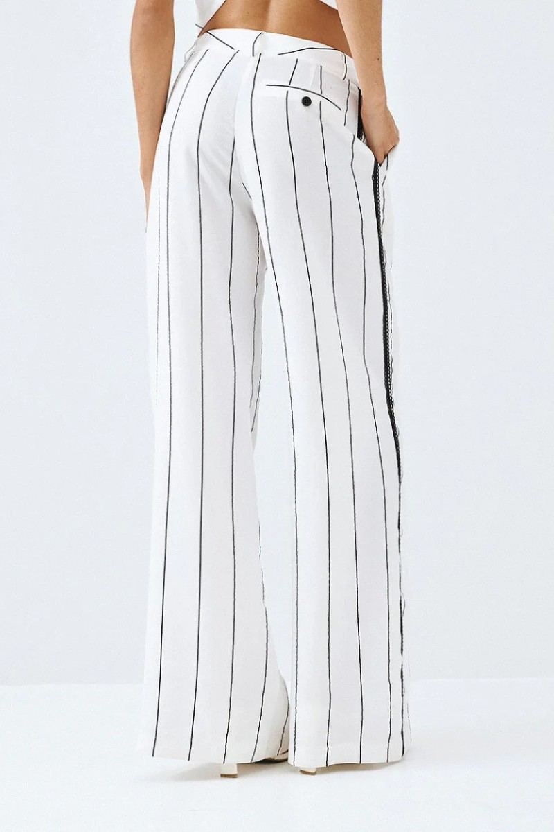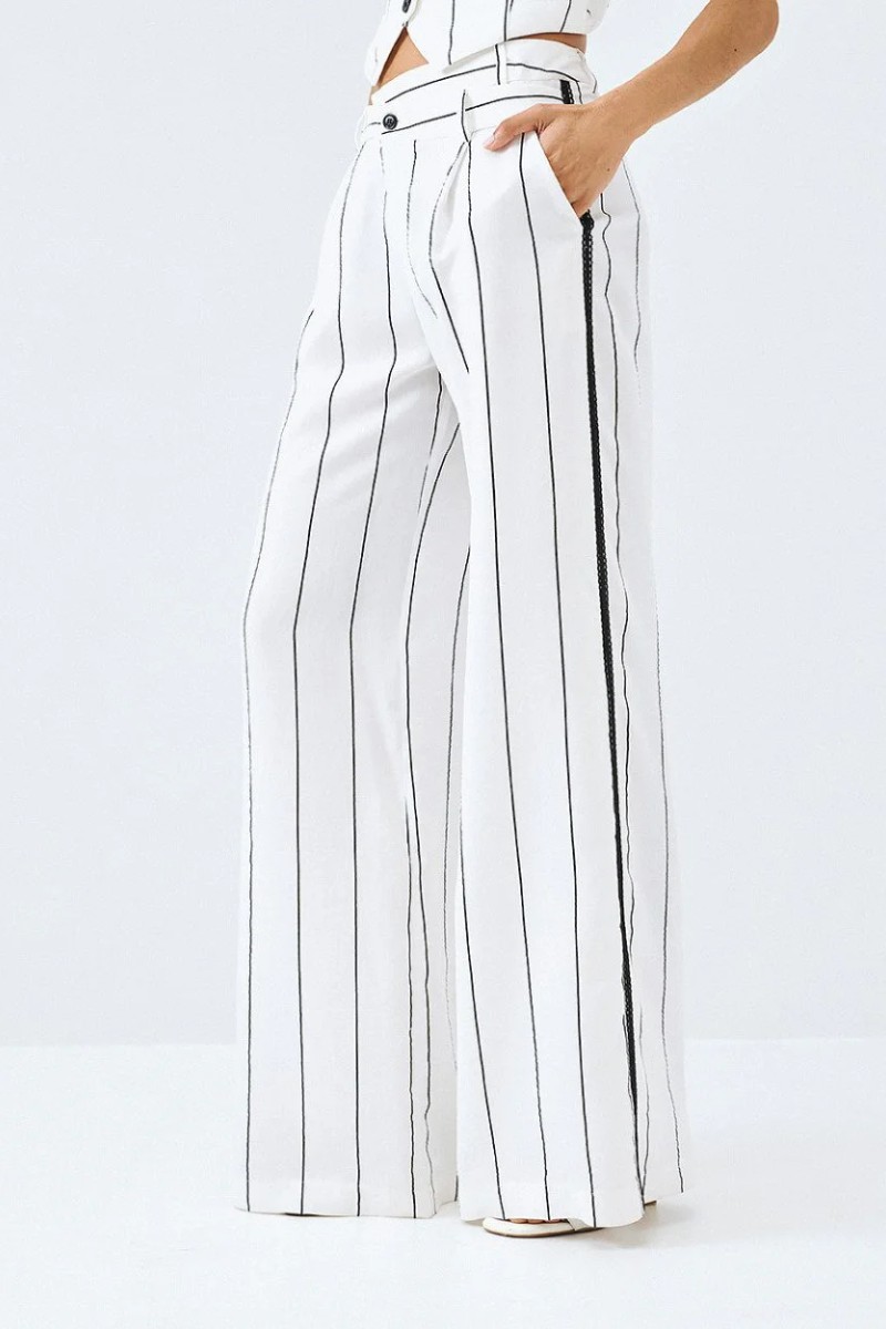 Ριγέ wide-leg παντελόνα με πιέτες μπροστά και πλεκτή λεπτομέρεια στα πλαϊνά.