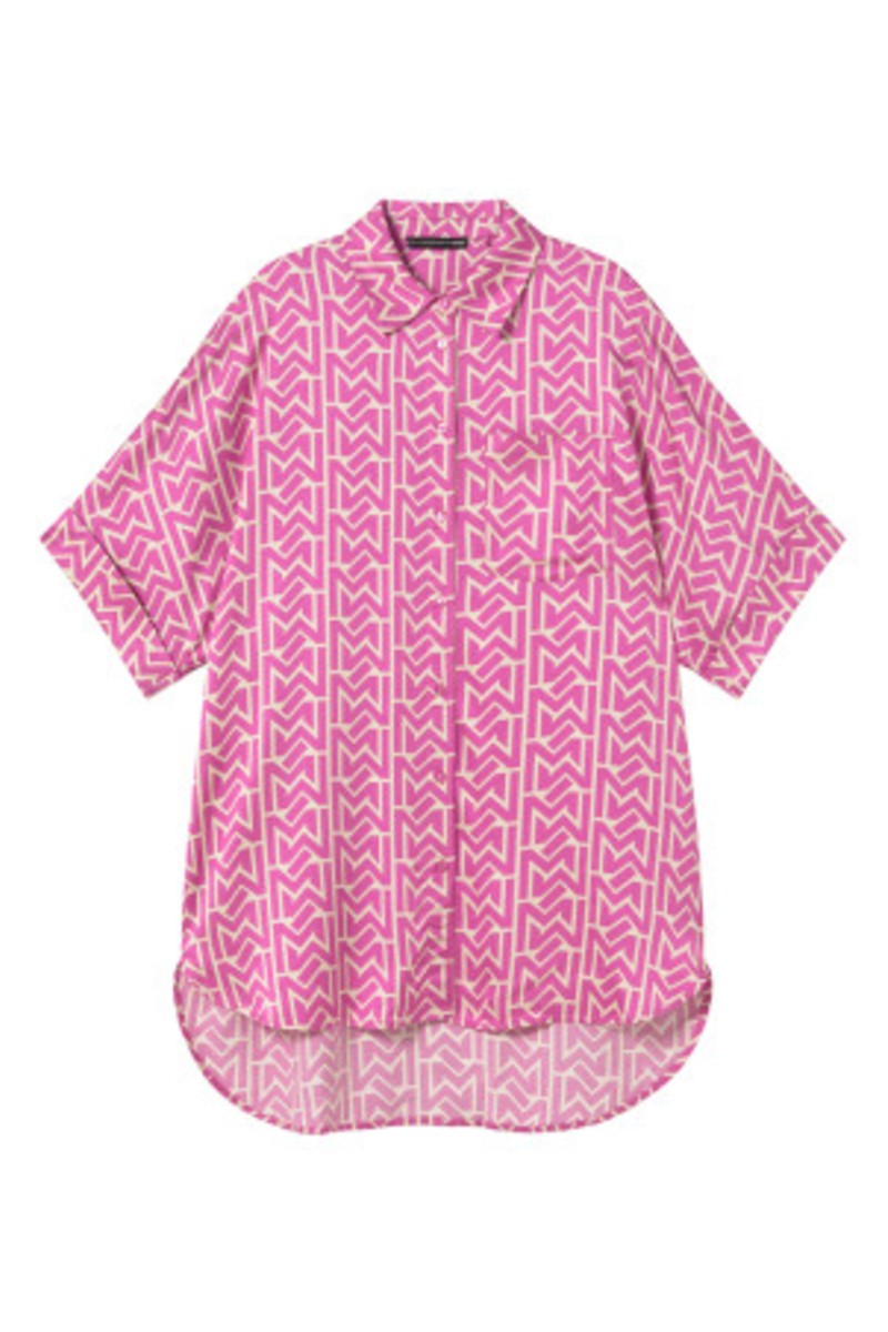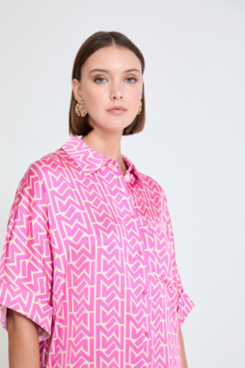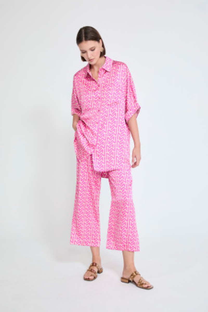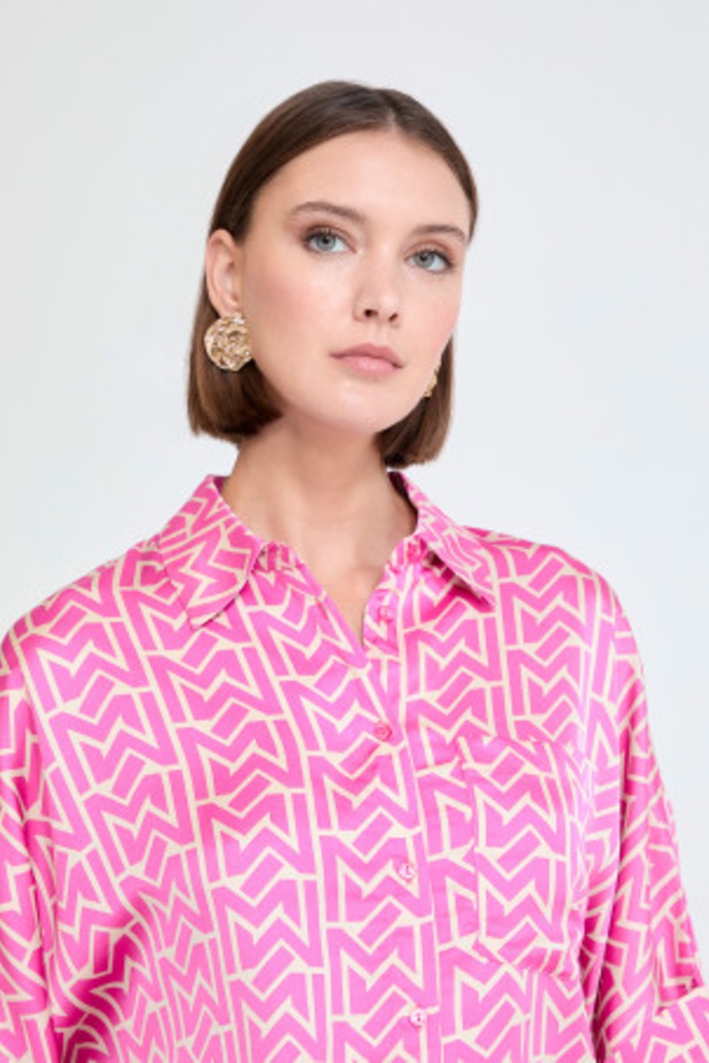 Σατέν πουκάμισο με κοντό μανίκι και γεωμετρικό τύπωμα σε ροζ αποχρώσεις.