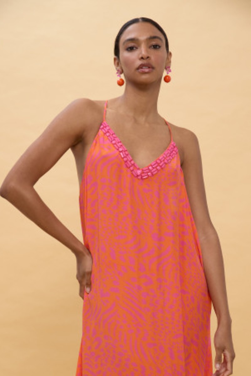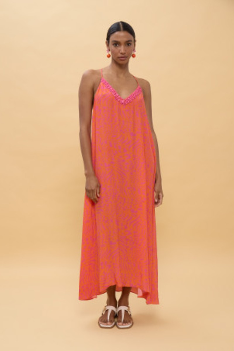 Μακρύ φόρεμα με αέρινο σχέδιο και ζωηρό τύπωμα σε διάφορα σημεία.